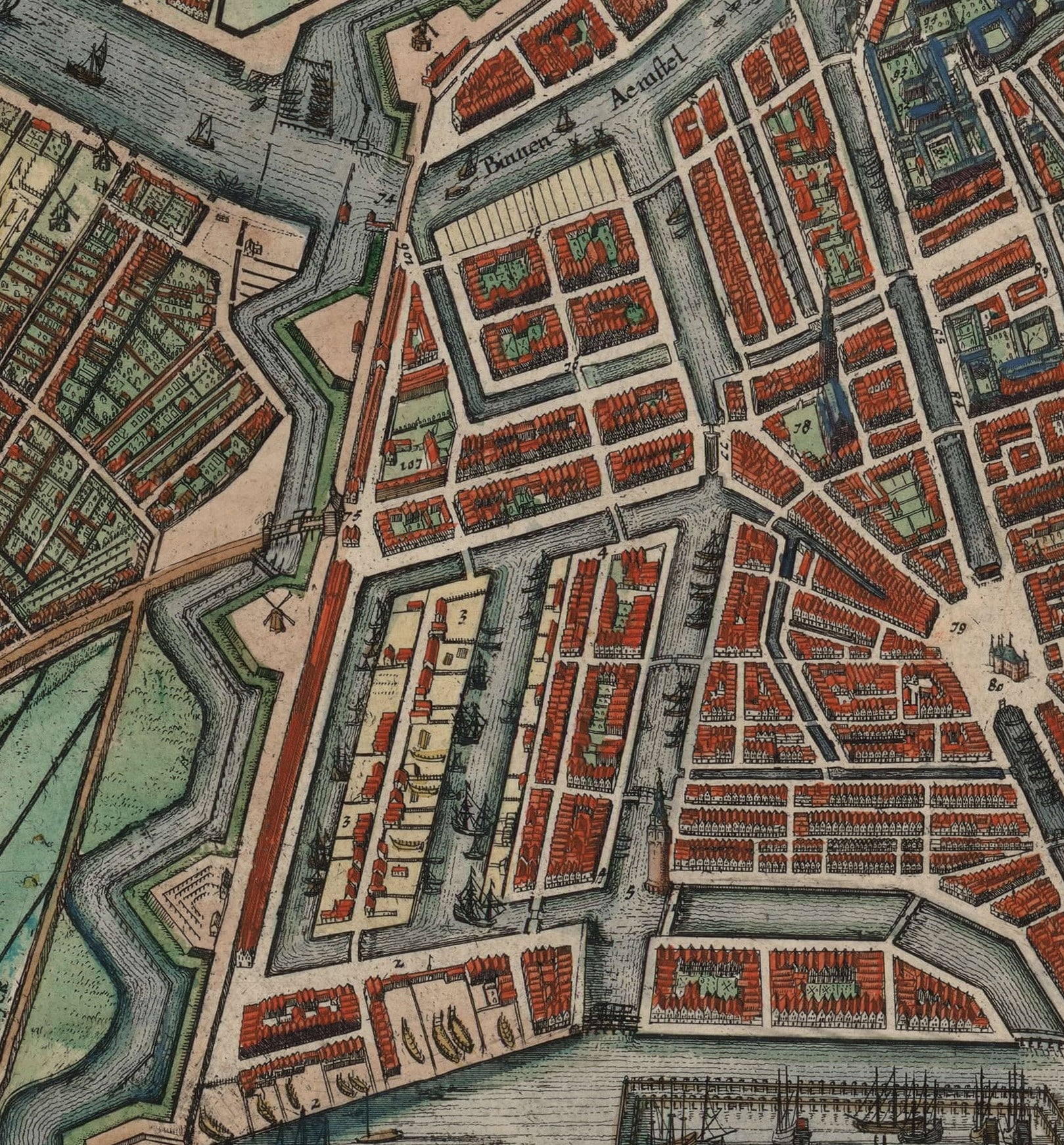 Partie est d’Amsterdam, où s’installaient de nombreux nouveaux arrivants. La flèche de la Zuiderkerk domine la maison d’Antonio Lopes Suasso. Carte de Joan Blaeu de 1649 © Biblioteca Nacional de España