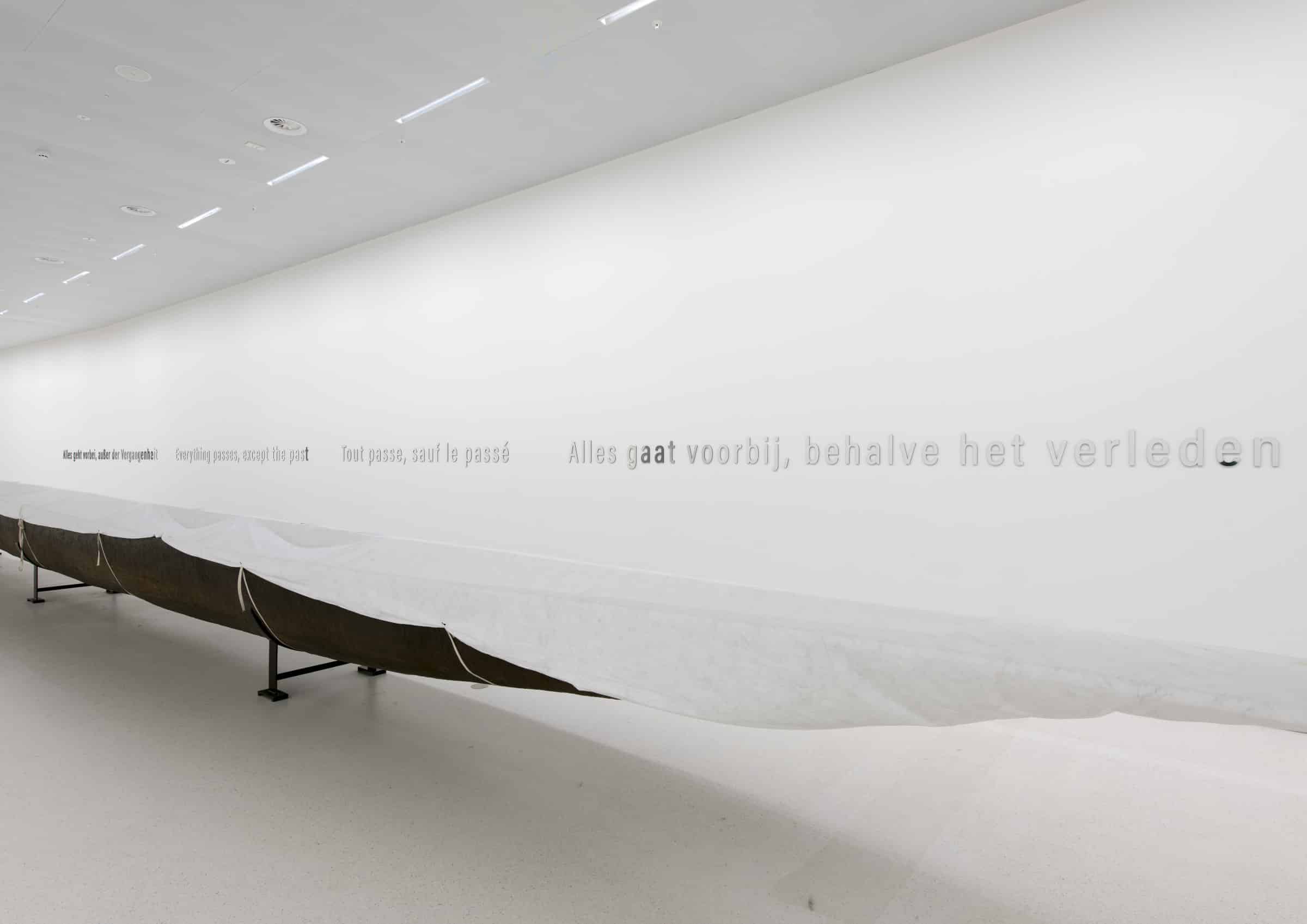 La grande pirogue de l’AfricaMuseum à Tervuren, avec, sur le mur, en quatre langues, l’inscription suivante: «Tout passe, sauf le passé». © Collectie AfricaMuseum