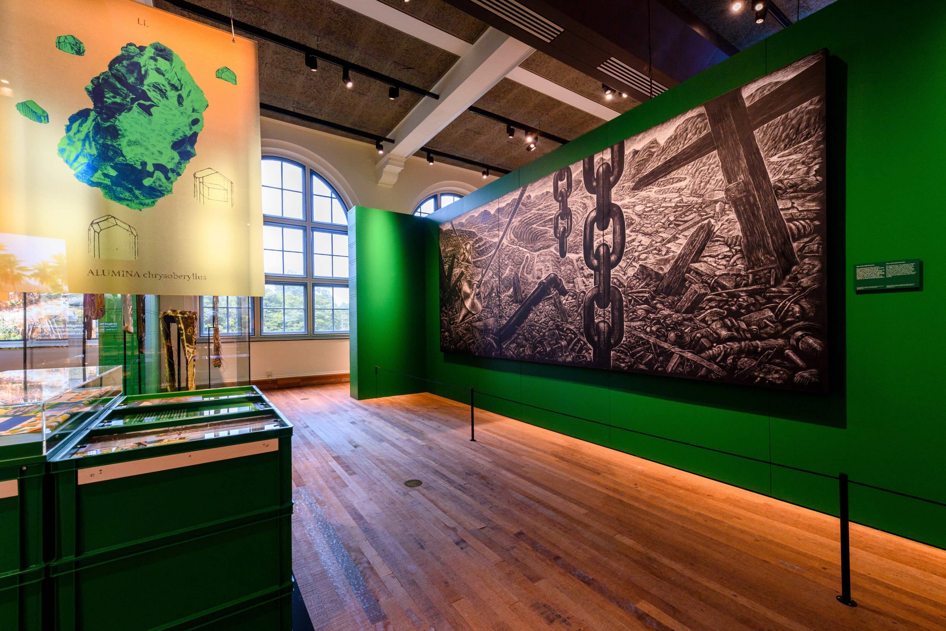 Pour donner un autre exemple de critique à l’égard de la collection, Wayne Modest désigne une grande peinture contemporaine en noir et blanc intitulée Tales of the Gold Mountain (2012), qui représente un paysage minier dévasté et pollué, avec des chaînes et une croix. «L’artiste indonésien Maryanto attire ainsi notre attention sur l’exploitation minière et sur ce que signifie l’extraction. Certains échantillons de minéraux font partie des premiers objets de notre collection. Lorsque vous regardez les magnifiques objets exposés dans notre musée, n’oubliez pas que le métal a été extrait quelque part et qu’aujourd’hui encore, cette extraction a un impact sur la planète».