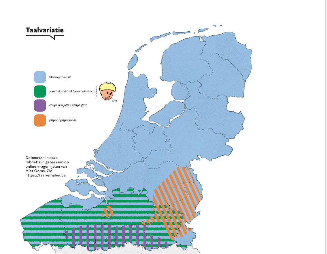 Encore plus informelles et moqueuses sont les expressions employées dans le Brabant septentrional et le Limbourg – pispotkapsel (coupe pot de chambre), abrégée en pispot (pot de chambre) –ou dans le sud de la Flandre– coupe à la jatte, coupe et jatte étant deux termes français très courants dans de nombreux dialectes flamands.