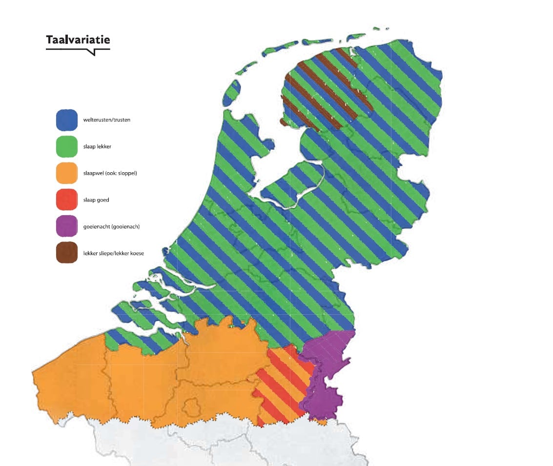 Légende des couleurs: bleu: welterusten/trusten; vert: slaap lekker; orange: slaapwel (également: sloppel); rouge: slaap goed; violet: goeienacht (gooienach); brun: lekker sliepe/lekker koese© Nicolas Trottier