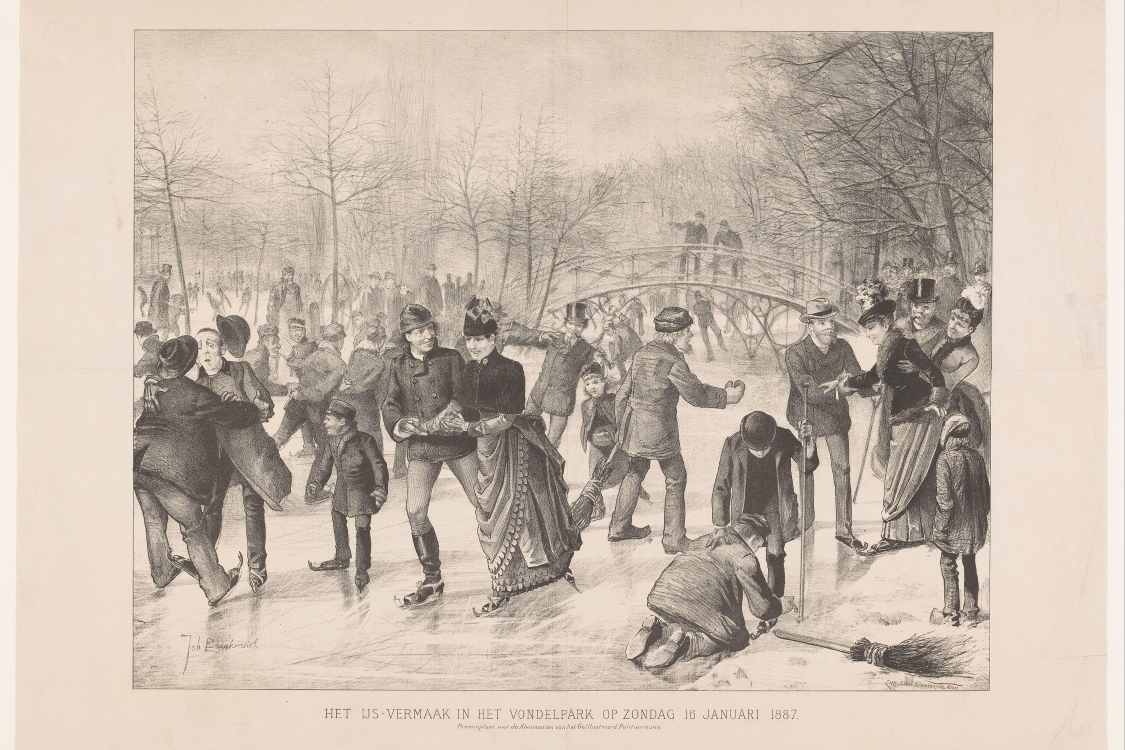 Patineurs dans le Vondelpark d’Amsterdam, gravure de 1887. Quelques Amstellodamois fortunés ont financé de leurs propres deniers, en 1865, l’aménagement de l’actuel Vondelpark. Il devait devenir un parc de promenade verdoyant destiné à la classe ouvrière dans une ville jugée monotone. © Rijksmuseum, Amsterdam