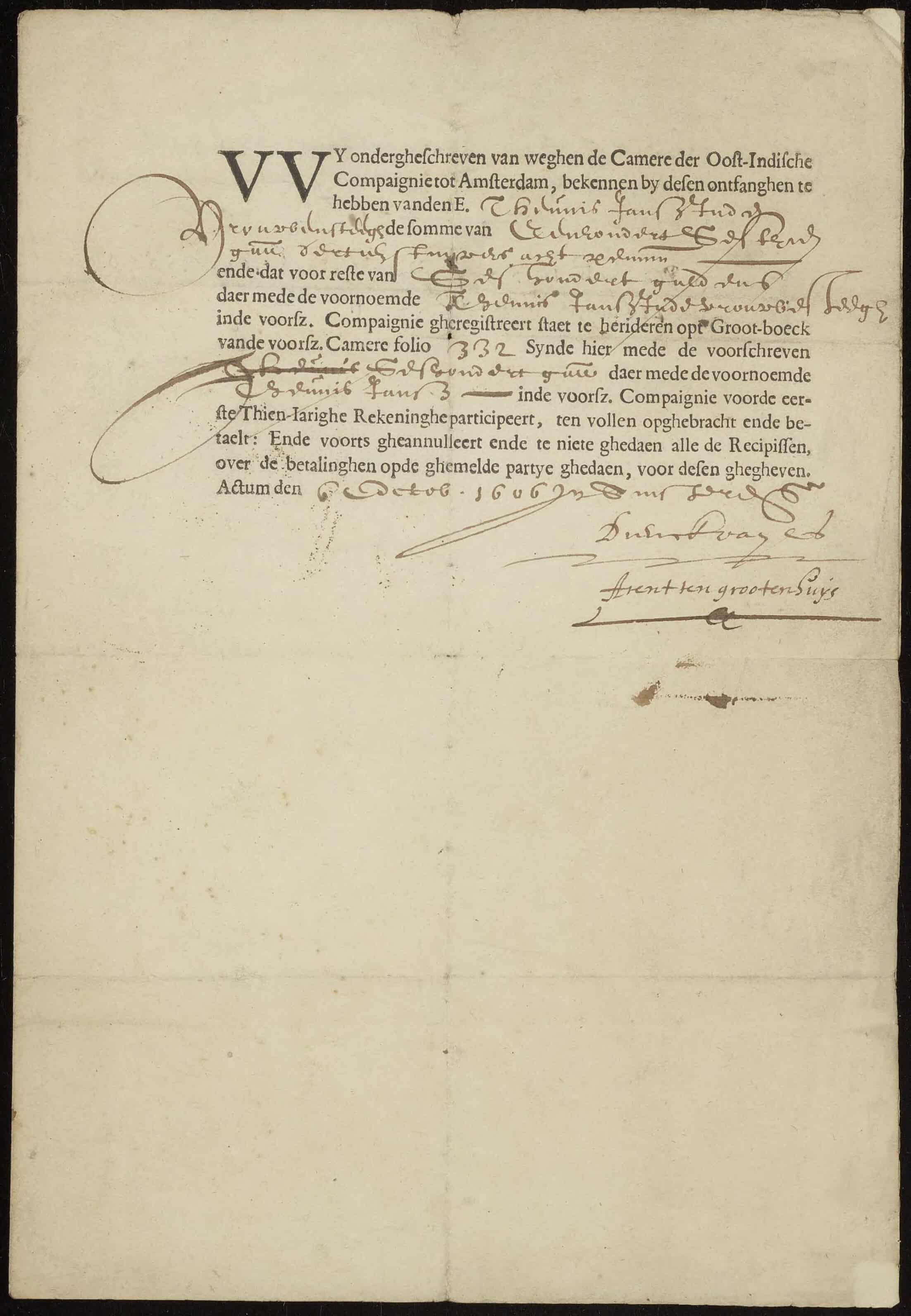Action de la VOC, achetée par Theunis Jansz en 1606, signée par Dirk van Os © Stadsarchief Amsterdam