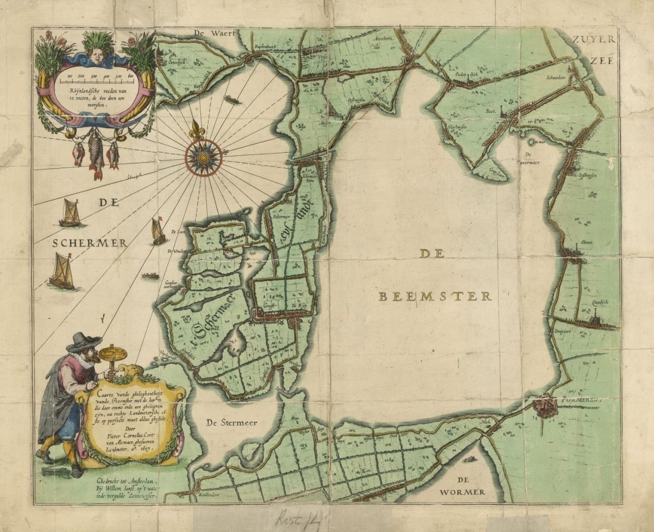 Malheureusement, le plan essuie un sérieux revers. En 1610, une violente tempête de nord-ouest provoque la rupture de la digue de ceinture à peine achevée, de sorte que le lac se remplit à nouveau. Au lieu de baisser les bras, Van Os décide d’investir encore plus d’argent dans l’opération. En 1612, le lac est enfin à sec, mais le sol s’avère impropre à la culture. De grands élevages voient alors le jour, avec les fameuses fermes à toit pyramidal ou stolpboerderijen. Ce sera son dernier projet ; Dirk meurt en 1615. Dans l’intervalle, Amsterdam est devenue un important centre commercial et financier, possédant sa propre banque de dépôt (Wisselbank), sa Bourse et son mont-de-piété (Stadsbank van Lening).
