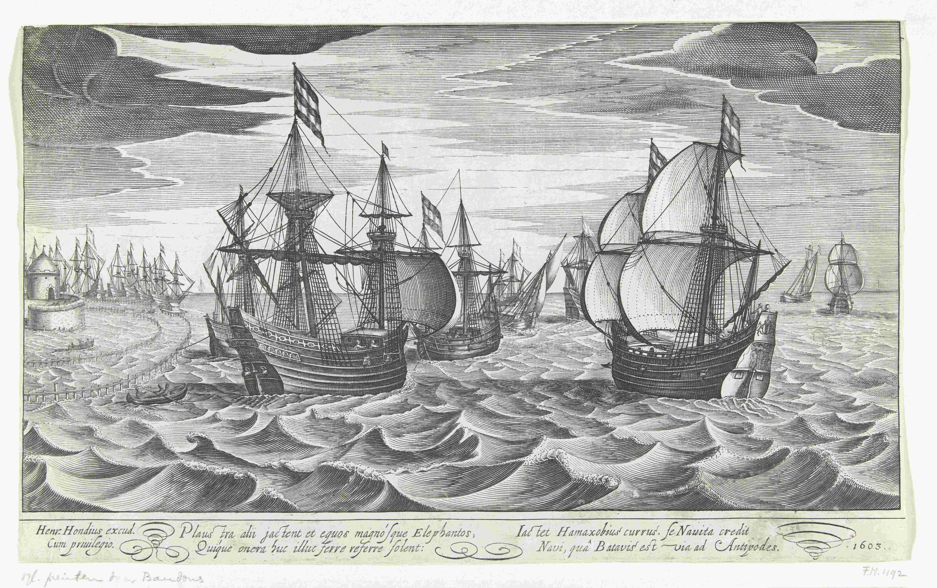 Flotte de neuf navires partant d’Amsterdam pour les Indes orientales. Estampe attribuée à Robert de Baudous, 1603. En 1594, Dirk van Os a pris une participation dans la Compagnie van Verre, un groupe de jeunes marchands ambitieux qui voulaient gagner les Indes orientales en croisant le cap de Bonne-Espérance, par la force si nécessaire.© Rijksmuseum, Amsterdam