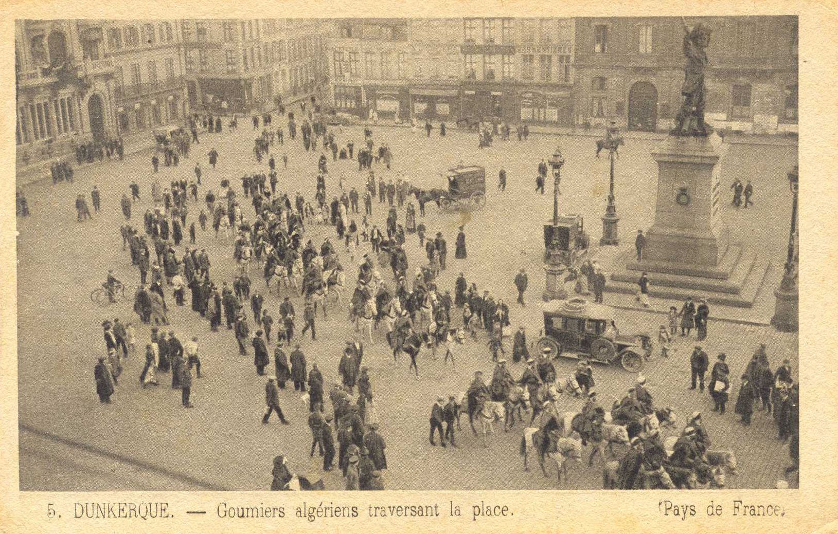 Des goumiers algériens traversent la place Jean-Bart en 1915.Très vite, on manque de bras. Les Anglais enrôlent des dockers britanniques pour pallier l’absence des dockers dunkerquois, appelés sous les drapeaux. Riz, farine, sucre, tabac, sel, café, conserves, viandes mais aussi foin et avoine pour les chevaux comptent autant que les obus. Les bœufs vivants sont remplacés par la viande frigorifiée venant même d’Australie pour nourrir les troupes. On manque d’autant plus de bras que les navires civils continuent d’accoster. En 1917, les Anglais enrôlent des Égyptiens qui s’enfuient au premier bombardement. On embauche à la place des civils chinois, déplorablement accueillis et assignés à résidence, pour le port à Saint-Pol-sur-Mer et pour l’usine Firminy, militarisée, à Leffrinckoucke. Certains resteront longtemps après la guerre.