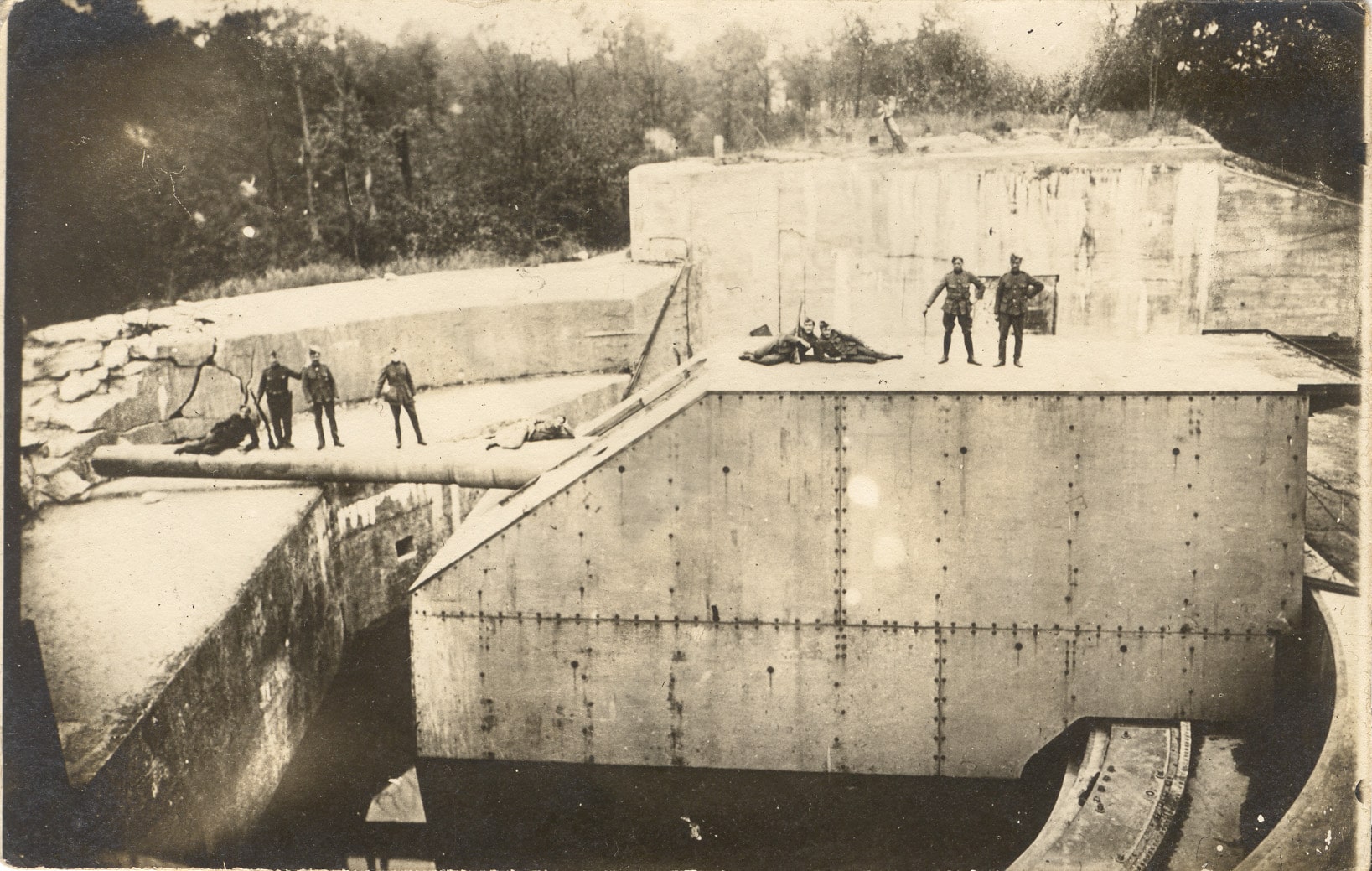 Les Alliés inspectent le canon Lange Max à Leugenboom en 1918.Dunkerquois sous cloche