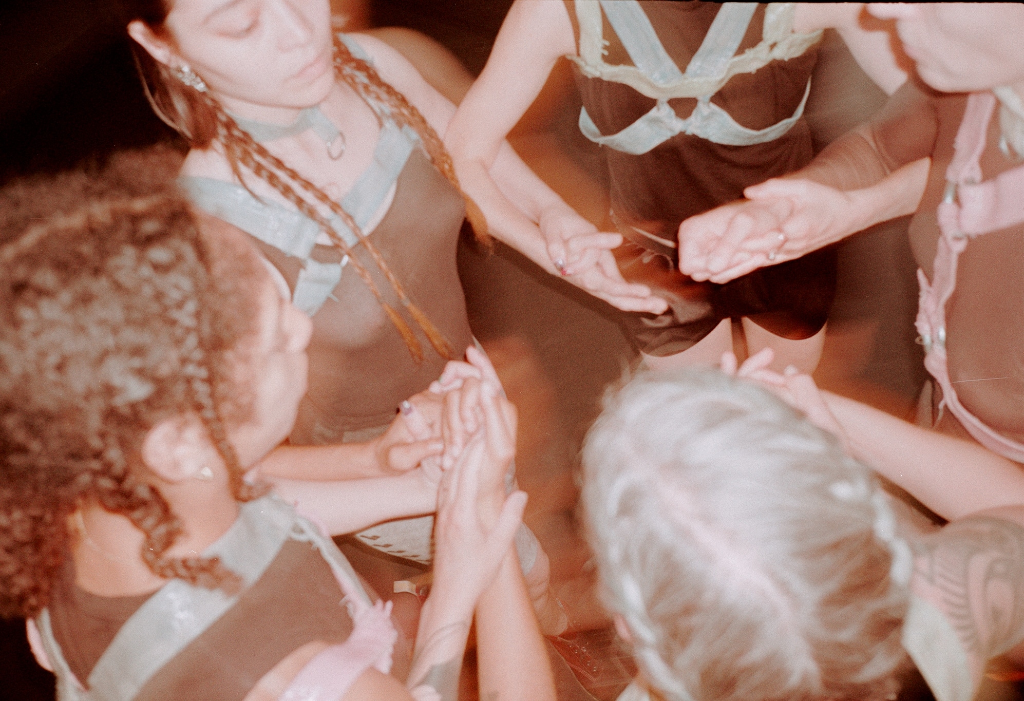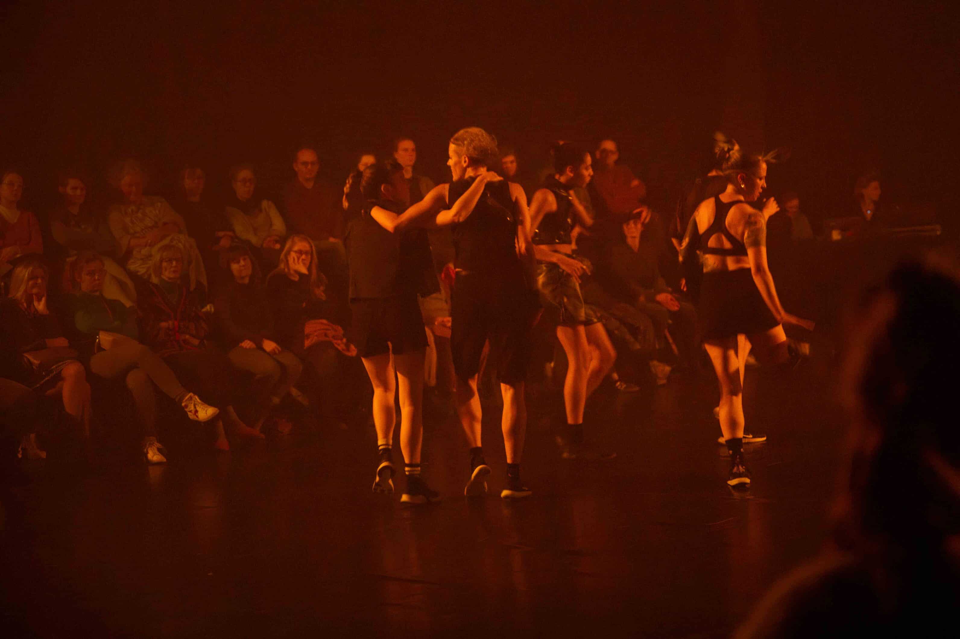Évidemment, la grande différence avec cette version «spontanée» du hakken est que les performances de Lisa Vereertbrugghen sont chorégraphiées. While We Are Here (2023) trace un lien conceptuel entre le gabber et la musique folk à travers cinq danseuses qui se déplacent en cercle sur la scène. Le timing des mouvements et la position des corps dans l’espace et les uns par rapport aux autres sont définis par la chorégraphie, mais ce cadre fixe laisse à chacune suffisamment d’espace pour exprimer sa personnalité et laisser parler l’émotion.