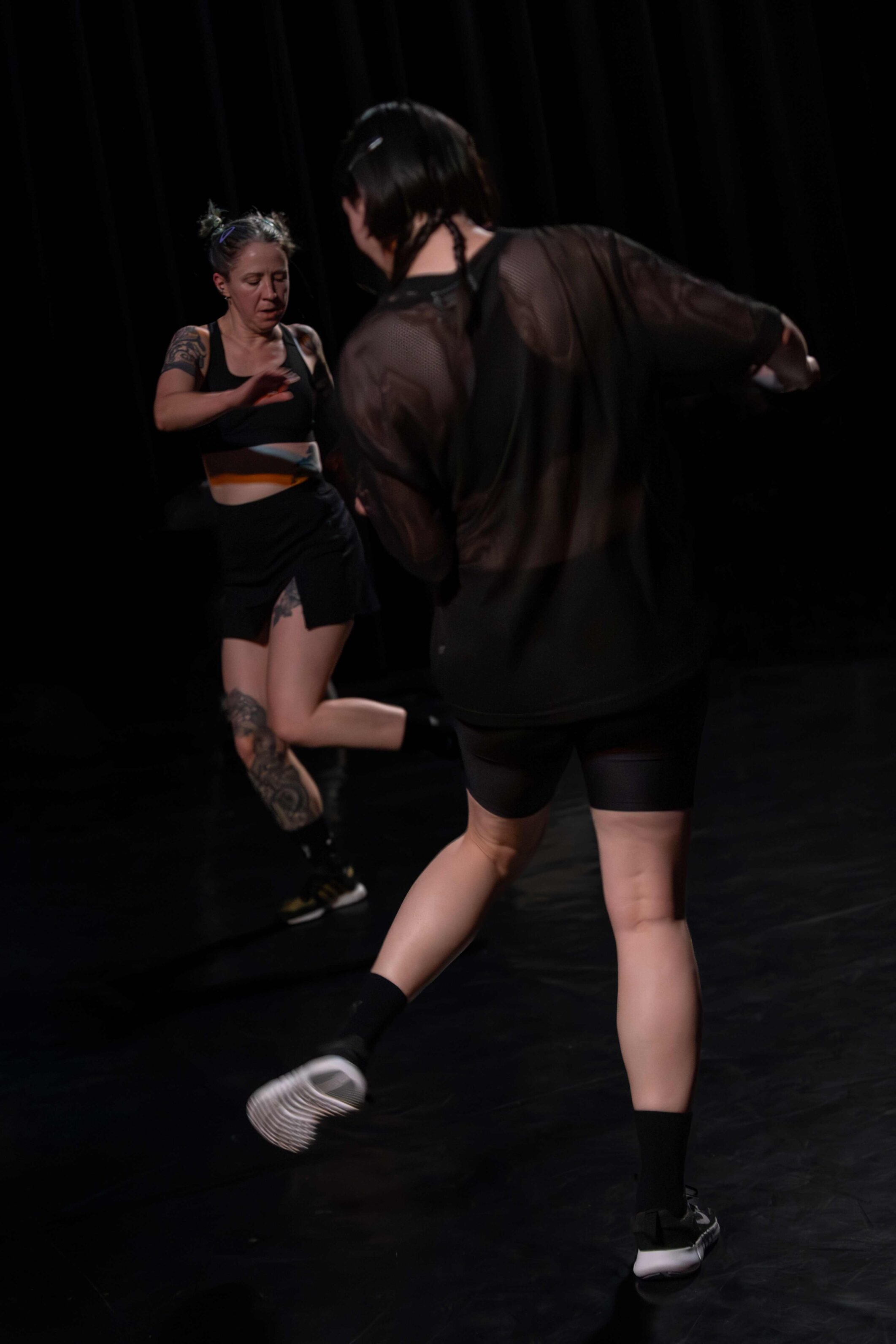 «Aucune des danseuses de While We Are Here n’avait d’expérience avec le gabber ou la techno en général. J’ai pu esquisser avec chacune d’entre elles un style unique qui honore ses dispositions personnelles tout en restant dans le registre consacré du gabber. C’était un exercice d’équilibriste: à quel moment un mouvement devient si personnel qu’il est trop éloigné du reste? Où est la frontière entre personnalité et communauté? Ma chorégraphie définit le cadre, mais les pas individuels restent le choix des danseuses».
