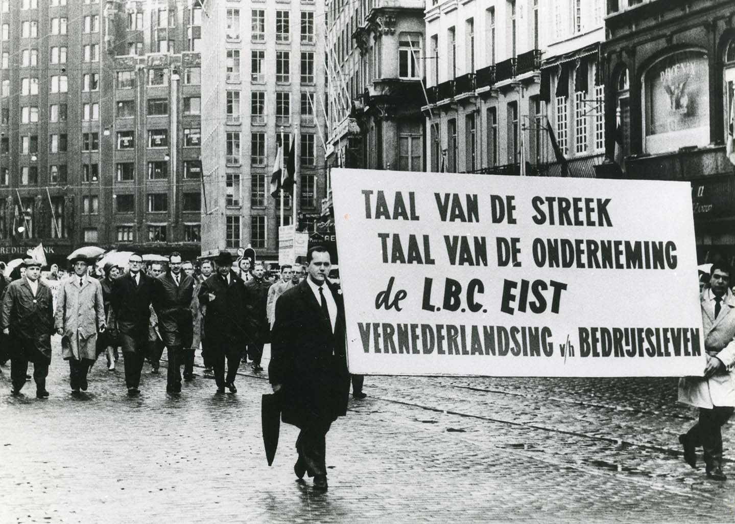 Manifestation Rerum Novarum à Anvers (1962). La Centrale nationale des employés (LBC) soutient l’appel à la néerlandisation du monde de l’entreprise. © KADOC, Louvain / Encyclopédie du Mouvement flamand