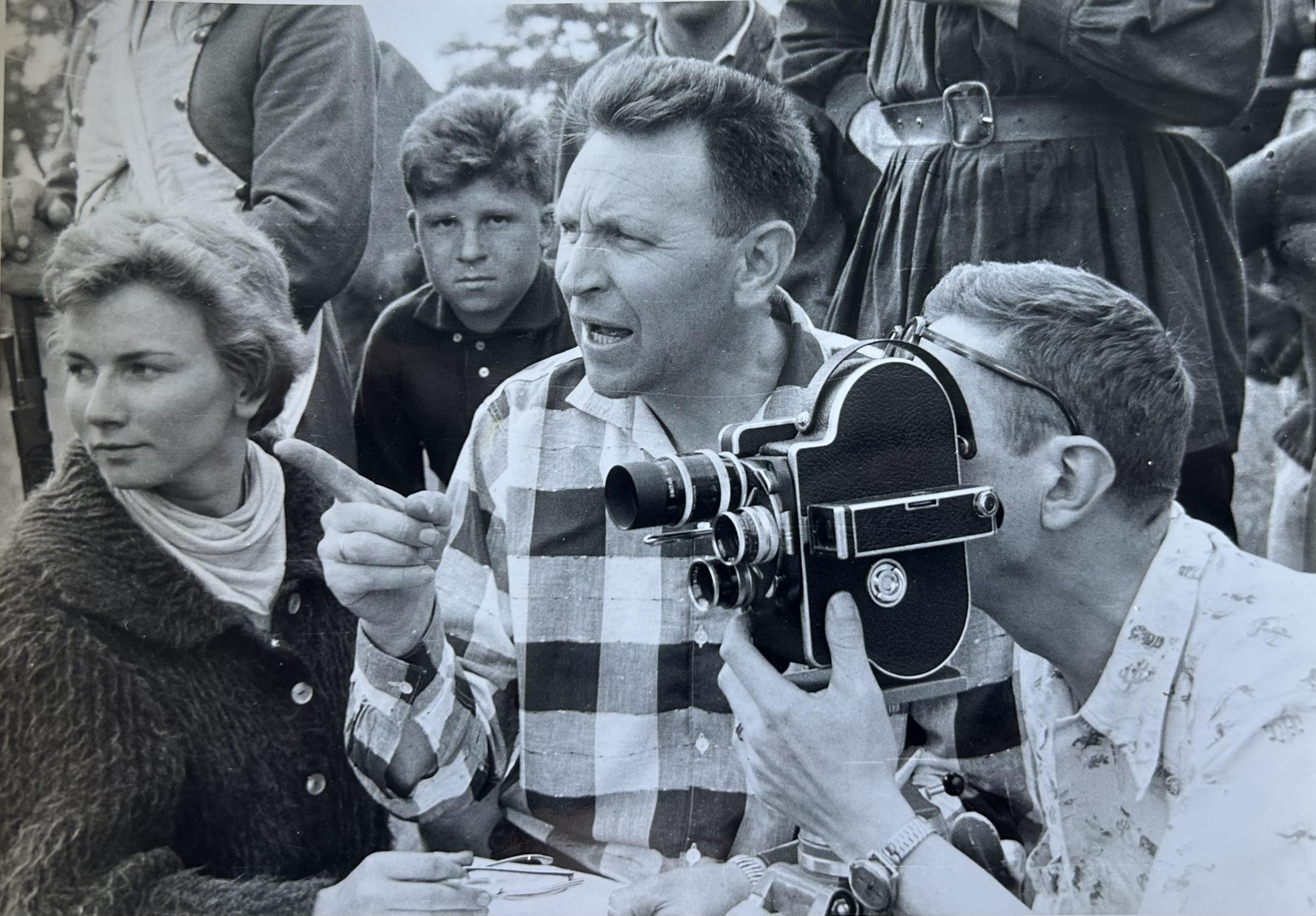 Hein Beniest avec la scripte Lieve Redant et le caméraman Jef Van Nooten lors du tournage de Brigands voor outer en heerd (1961)© Marleen Beniest