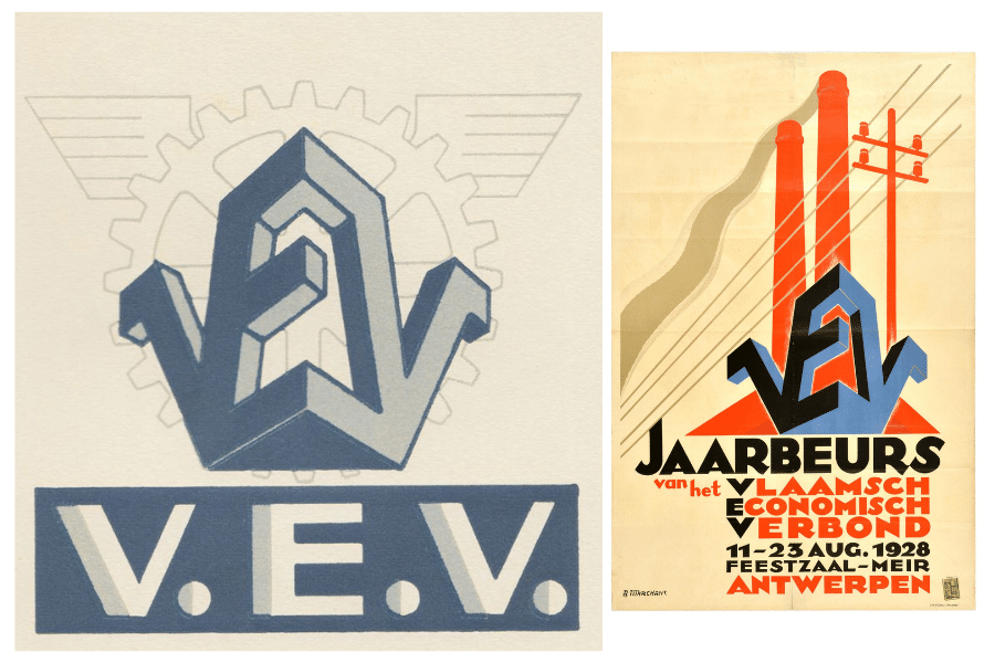 Logo et affiche du Vlaams Economisch Verbond. L’organisation est fondée en 1926, avec Lieven Gevaert comme premier président. © ADVN Anvers / Encyclopédie du Mouvement flamand