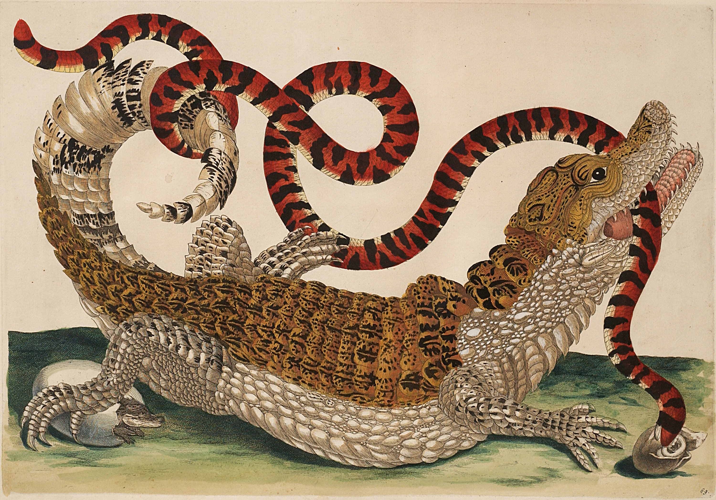 Maria Sibylla Merian, Caïman à lunettes avec un faux serpent corail sud-américain (vers 1701–1705)© National Museum of Women in the Arts, Washington DC