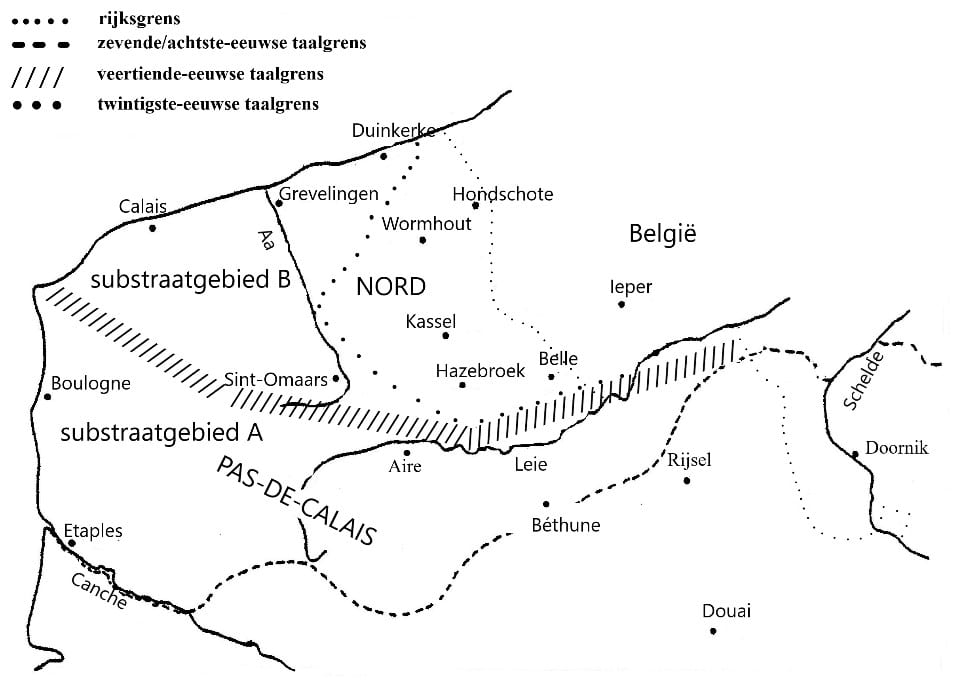 Ce qu’il entendait par là, c’est que même dans les endroits où l’on entend encore du néerlandais régional, il ne subsiste que dans la bouche de personnes âgées, vivant dans de petits villages ruraux. Cette «frontière» s’étend à l’est de Dunkerque, descend vers le sud pour virer vers l’est à hauteur d’Hazebrouck, et rejoint ensuite la frontière belge près de la ville française de Bailleul.