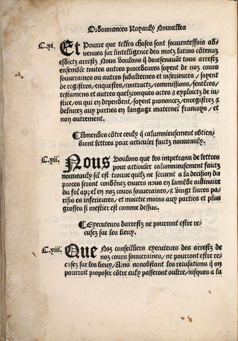Le texte évoque le «langage maternel françois», une expression qui renvoyait très vraisemblablement aux différentes langues régionales parlées sur le territoire. L’idée était simple: rendre les jugements, procès et décisions judiciaires compréhensibles pour celles et ceux à qui ils s’adressaient. Plusieurs textes juridiques antérieurs à l’ordonnance de Villers-Cotterêts viennent appuyer cette lecture. Ainsi une ordonnance de 1490 pour la région du Languedoc mentionne-t-elle le «langage François ou maternel». Une autre de 1510 parle de «vulgaire et langage du païs», et celle de 1535 propose encore une autre formule: «en Français ou à tout le moins en vulgaire du païs où seront faits lesdits procès et enquestes».