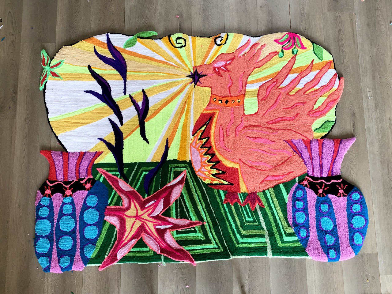 C’est précisément cette quotidienneté que Paraipan trouve importante. Habituellement, on ne prête guère d’attention à tous les tissus de notre vie, surtout à une époque où l’on peut commander de nouveaux vêtements et se les faire livrer en toute facilité. Dans cette démarche, la durabilité n’est pas une priorité. Le tufting contrebalance cette fugacité. Le processus de fabrication demande un réel effort et est assez imprévisible, car il se fait au revers. Ce que l’on voit à l’endroit peut être une surprise. Cette démarche relie Paraipan aux traditions (textiles) roumaines, qui proviennent souvent de la campagne. Mais l’artiste regarde aussi vers l’avenir: elle cherche des façons d’utiliser ce médium pour aborder des thèmes d’actualité, comme la manière dont les symboles personnels et culturels vous aident à cerner votre identité dans une société en constante évolution.