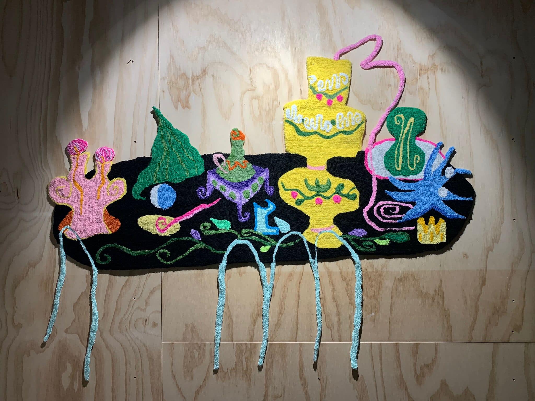 C’est précisément en raison de cette riche tradition que Iulia Paraipan (1996, vit et travaille à Enschede) voit la possibilité d’utiliser les textiles de nombreuses manières inédites. Depuis des millénaires, les textiles servent d’expression culturelle, notamment en fixant et en transmettant les récits et l’histoire d’un peuple particulier. Un exemple bien connu à grande échelle est la tapisserie de Bayeux du XIe siècle, qui relate la bataille historique d’Hastings en 1066, telle une bande dessinée avant la lettre. À plus petite échelle, Paraipan a une démarche similaire avec les œuvres d’art tuftées et picturales avec lesquelles elle s’est démarquée lors de sa présentation de fin d’études à l’académie en 2023. Dans ces œuvres, l’attachement au foyer et l’identité sont étroitement liés, surtout si l’on compare des titres comme Dinner at Home et The Place I Come From (tous deux de 2023).