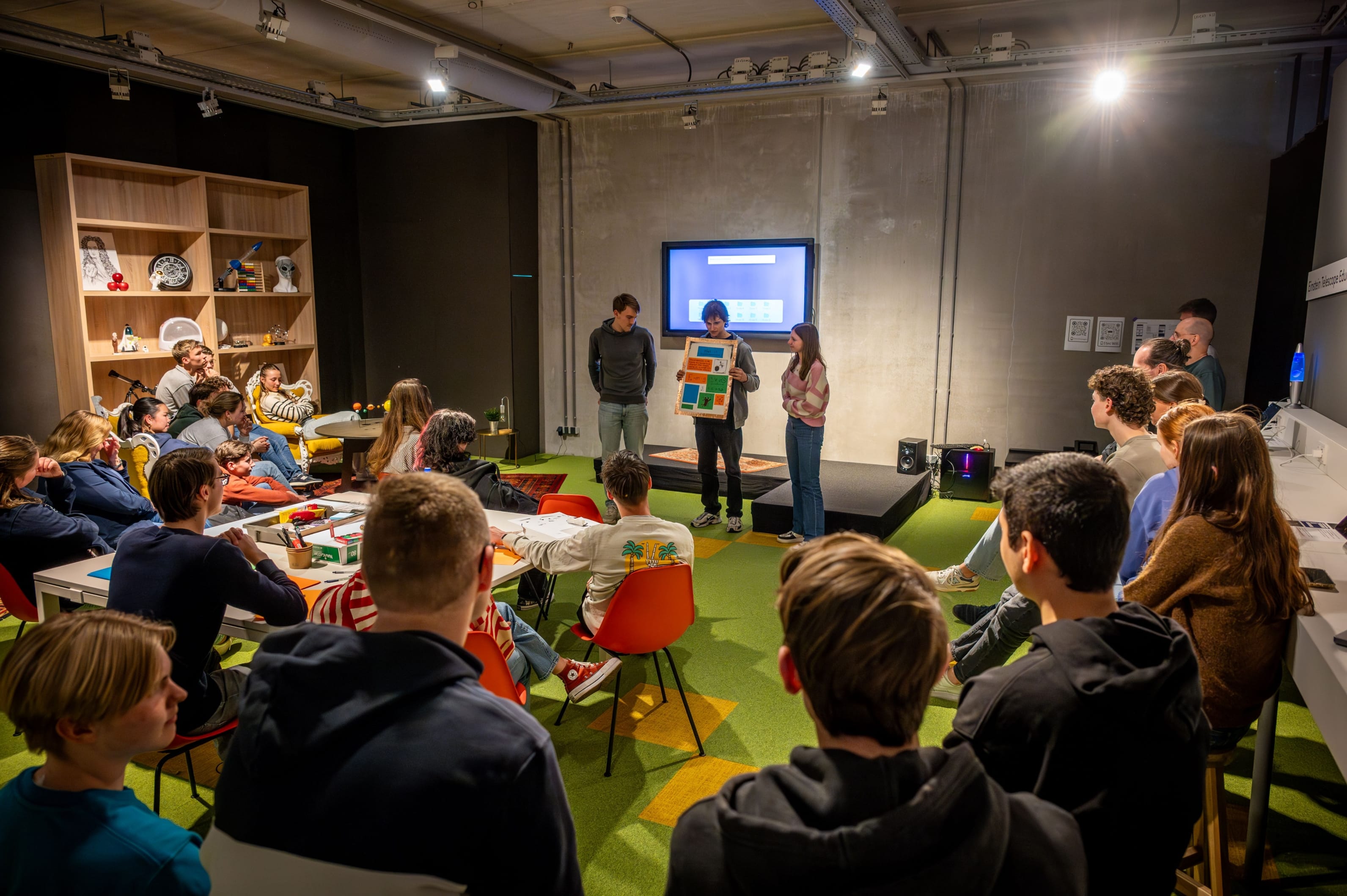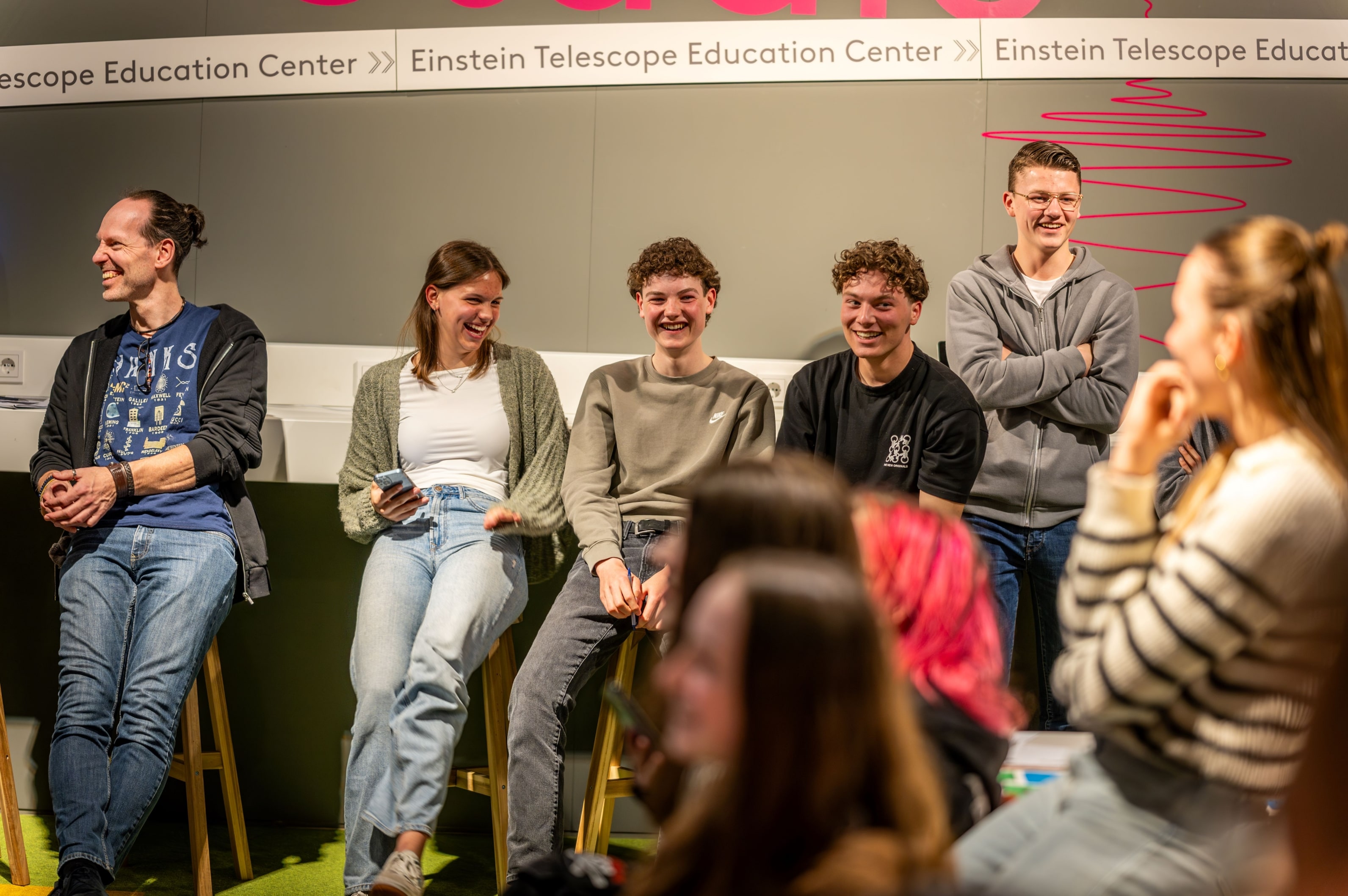 Une journée à l’Einstein Telescope Education Centre se termine par un compte rendu: les quatre groupes partagent leurs impressions et posent des questions. C’est à eux de décider de la forme que prendra ce compte rendu. Les élèves ont accès à un studio et peuvent choisir de se filmer, d’enregistrer un podcast ou, à l’ancienne, de créer une présentation ou une pièce de théâtre à montrer aux autres. Il est prouvé qu’il s’agit de la meilleure approche pour retenir les connaissances acquises.