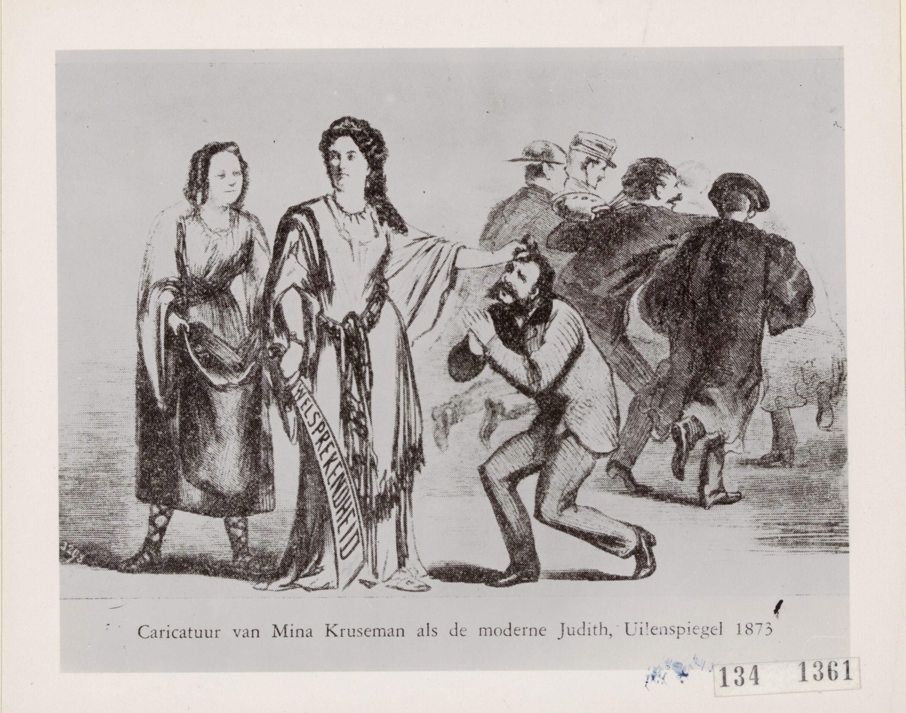 Caricature de 1873 présentant Mina Kruseman comme «une nouvelle Judith» décapitant la gente masculine comme l’avait fait l’héroïne biblique avec le général Holopherne, après s’être infiltrée dans le camp ennemi. En réponse, Kruseman intitula son recueil d’écrits De moderne Judith. © Wikimedia Commons