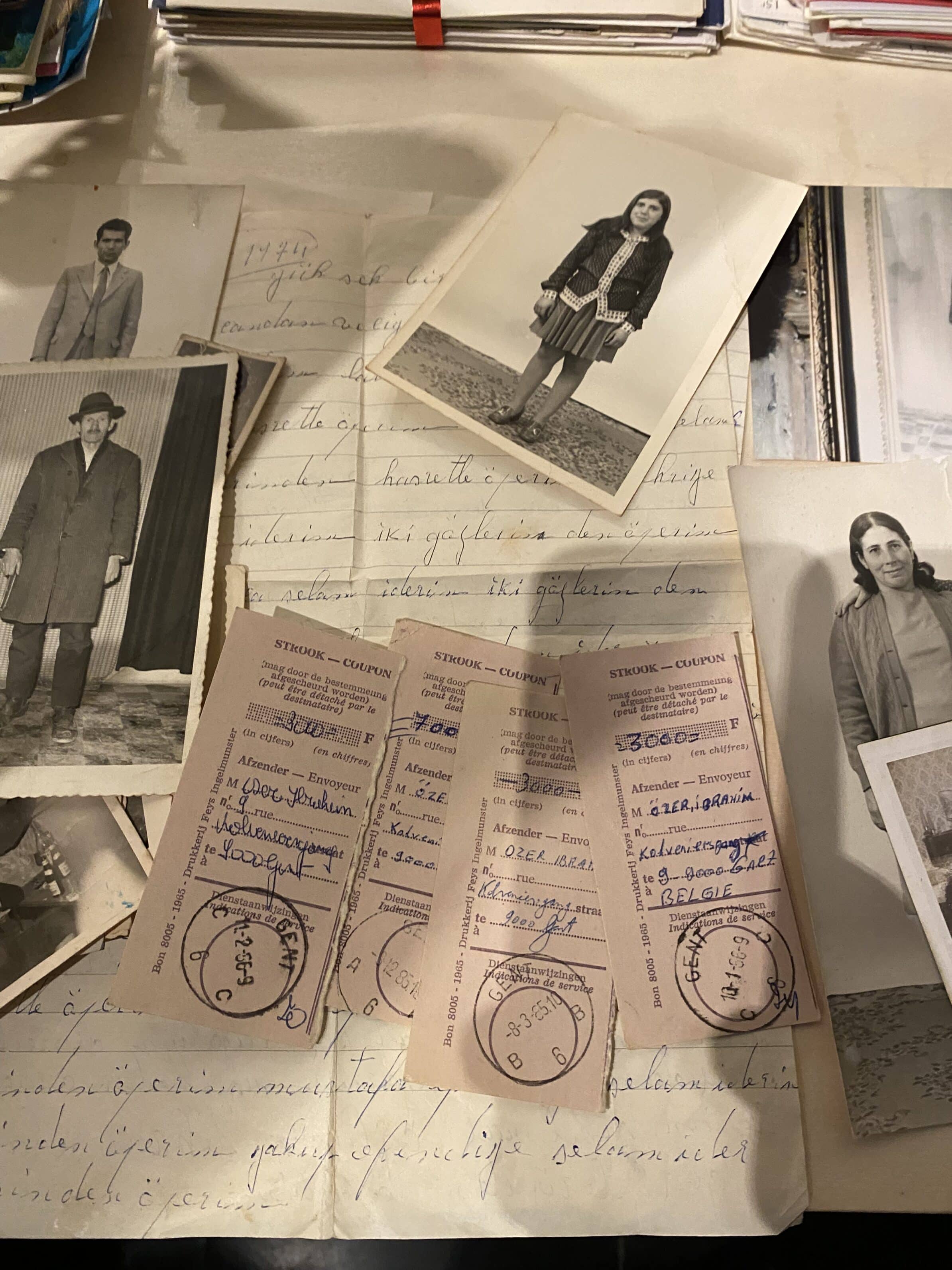 Reçus de transferts d’argent envoyés de Gand vers Emirdağ, accompagnés de lettres. Après avoir remboursé toutes ses dettes, Ibrahim Özer, installé à Gand, a pendant des années soutenu sa famille restée en Turquie au moyen de remises migratoires. © Collection Zehra Özer, De Poorten
