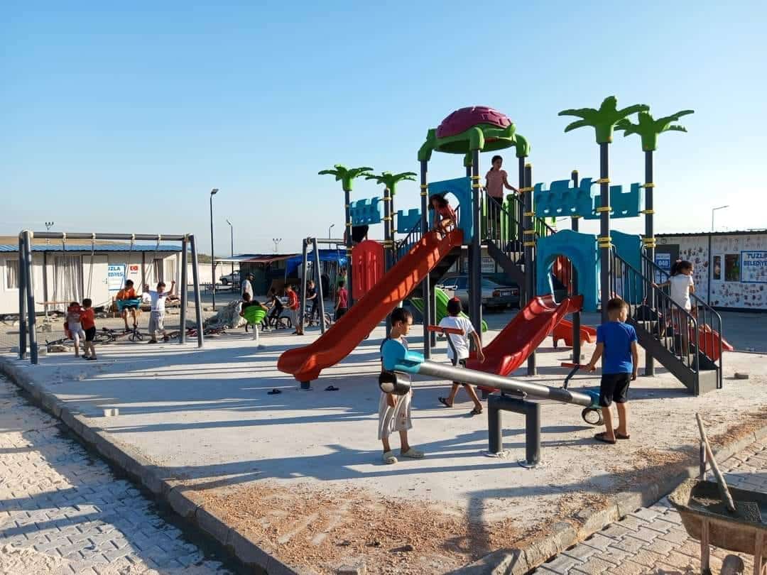 L’aire de jeux située au centre de Klein Gent. Le projet ne se limite pas à la fourniture de logements : il intègre également une prise en charge psychosociale des victimes du séisme. © Helping Hands Belgium