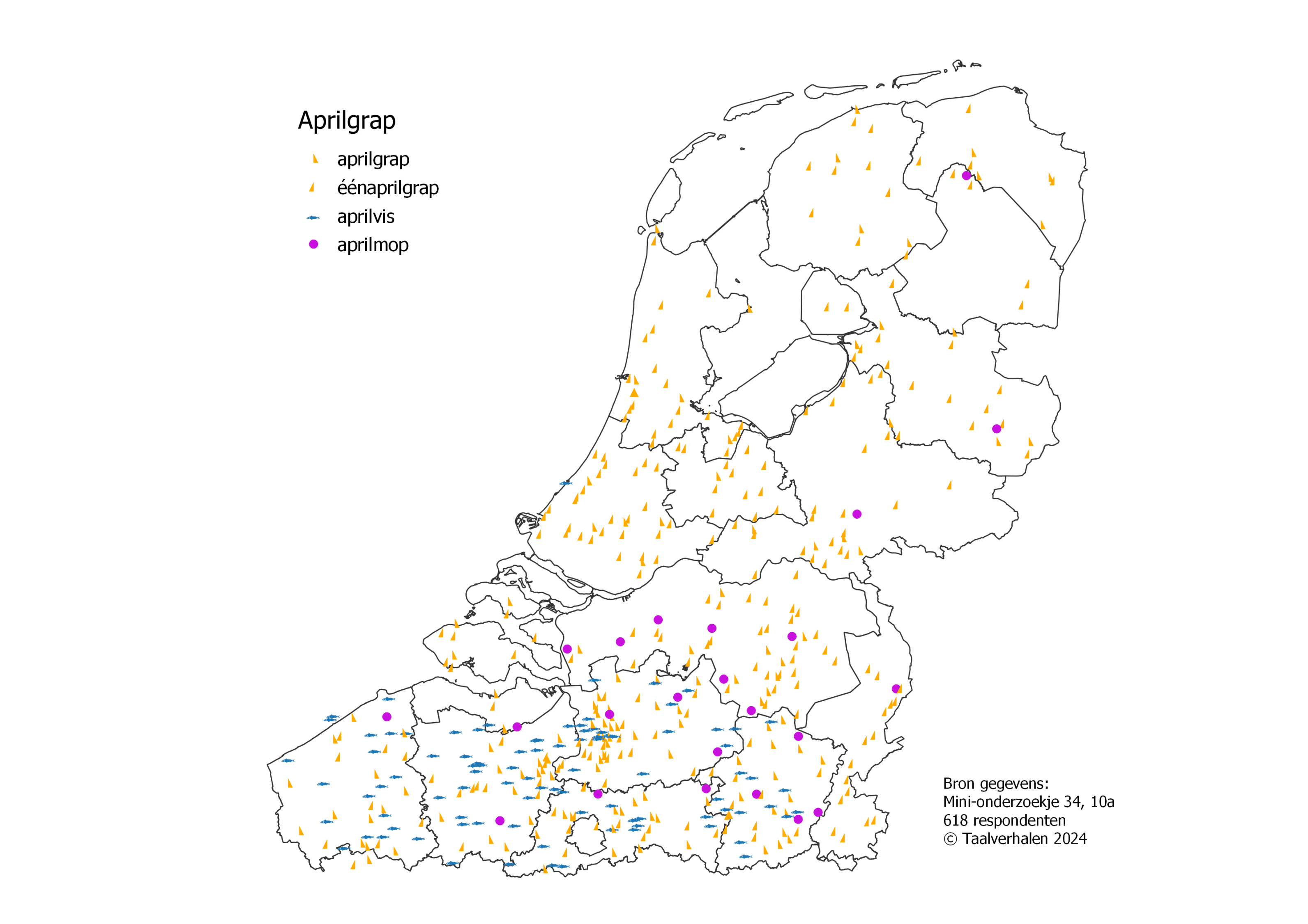 En néerlandais, la traditionnelle plaisanterie du 1er avril peut se dire de différentes manières: aprilgrap, éénaprilgrap ou encore aprilmop (grap et mop signifiant tous deux «blague»). Il n’y a qu’en Flandre que l’on rencontre aprilvis, qui est la traduction littérale du «poisson d’avril» en français.