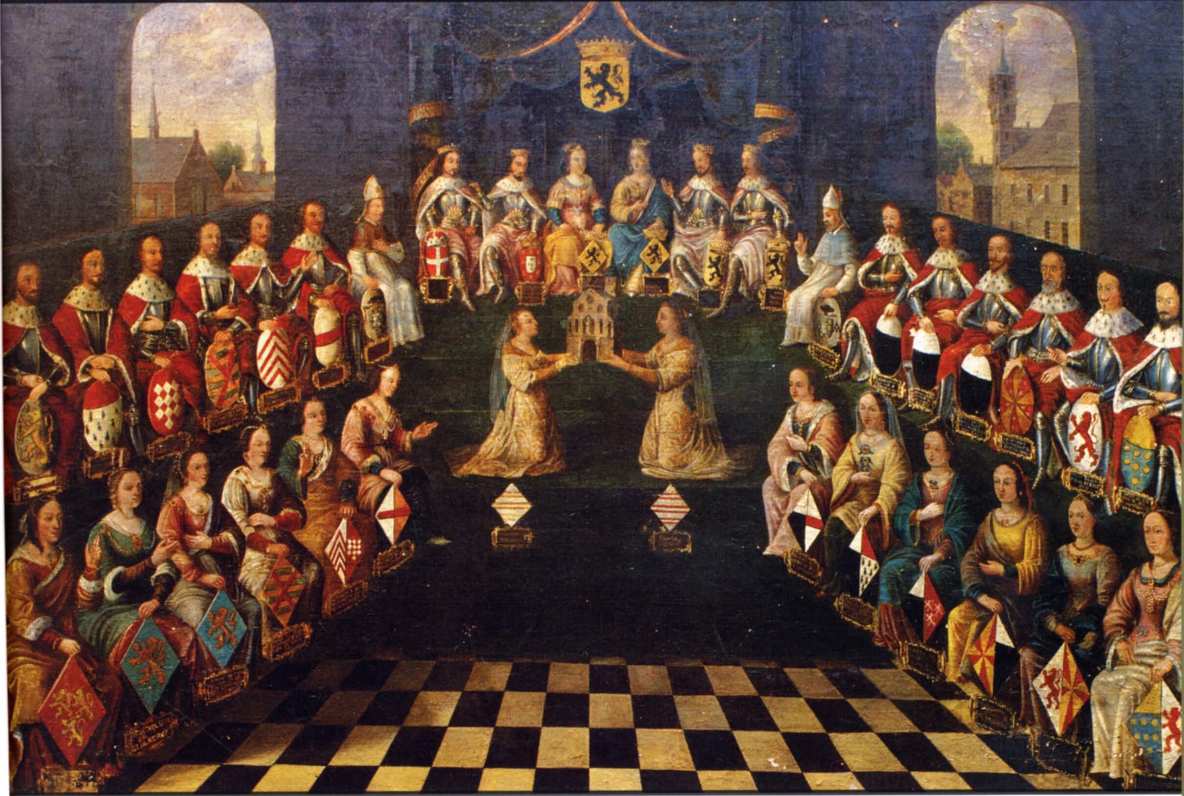 Peinture historique représentant des membres de la famille Utenhove impliqués dans la fondation des abbayes de Ten Bos et de la Bijloke, avec, dans la partie supérieure, les comtesses Jeanne et Marguerite de Flandre, après 1635. © Collection des Sœurs de Namur, abbaye du Nouveau-Bois, Gand