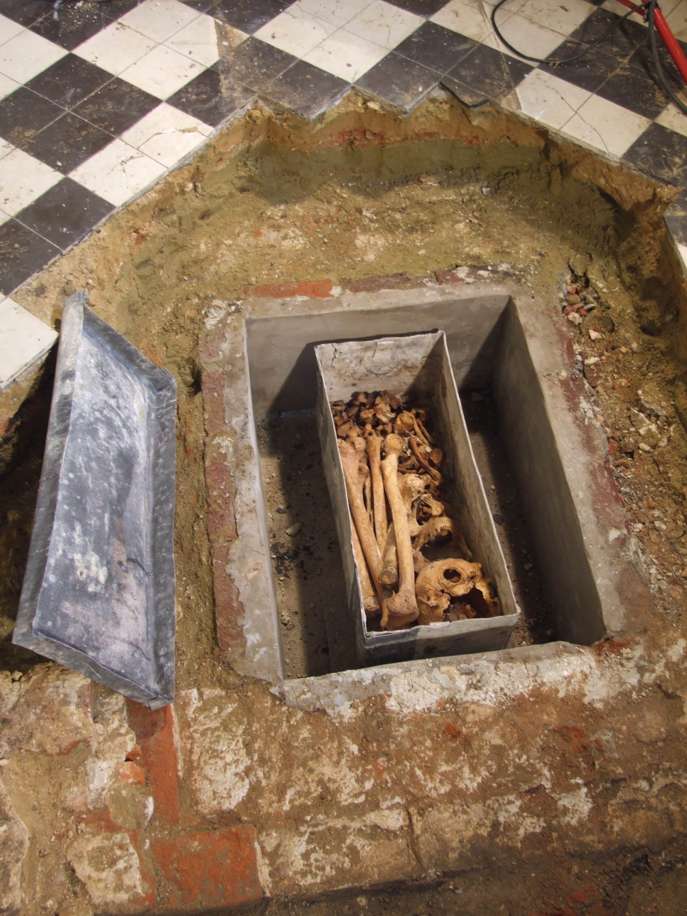 Coffret en plomb contenant les ossements de Fulco Utenhove, mis au jour lors de fouilles menées à la Bijloke en 2006. © De Zwarte Doos, Service archéologique de la Ville de Gand