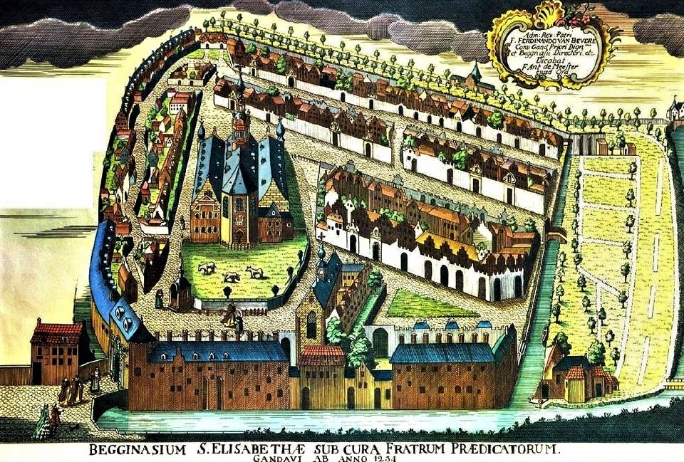 Ce mode d’habitat répondait à une nécessité croissante: assigner à ces femmes indépendantes un lieu de résidence fixe, et par là même contrôlable. En 1242, l’édification d’une chapelle et d’une infirmerie pour les soins de la communauté –cœur de tout béguinage– ainsi que l’octroi de divers privilèges jetèrent les bases du béguinage Sainte-Élisabeth. Par la suite, deux autres béguinages virent le jour à Gand: Notre-Dame-aux-Foins (Ter Hooie) en 1262 et Poortakker, sur la Oude Houtlei, en 1278. Les comtesses de Flandre ne furent donc pas, à proprement parler, les fondatrices des béguinages, mais les protectrices d’un mouvement déjà en marche. Elles prirent activement sous leur aile ces communautés laïques, alors promues comme un nouveau modèle de vie collective pour femmes autonomes.