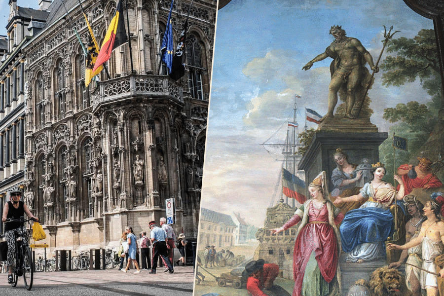 L'hôtel de ville de Gand et le détail de la toile Allegorie op de handel van Gent (Allégorie du commerce gantois) de Pieter van Reysschoot, exposée à l'hôtel de ville. © Stad Gent / Historische Huizen Gent, collectie Stadhuis