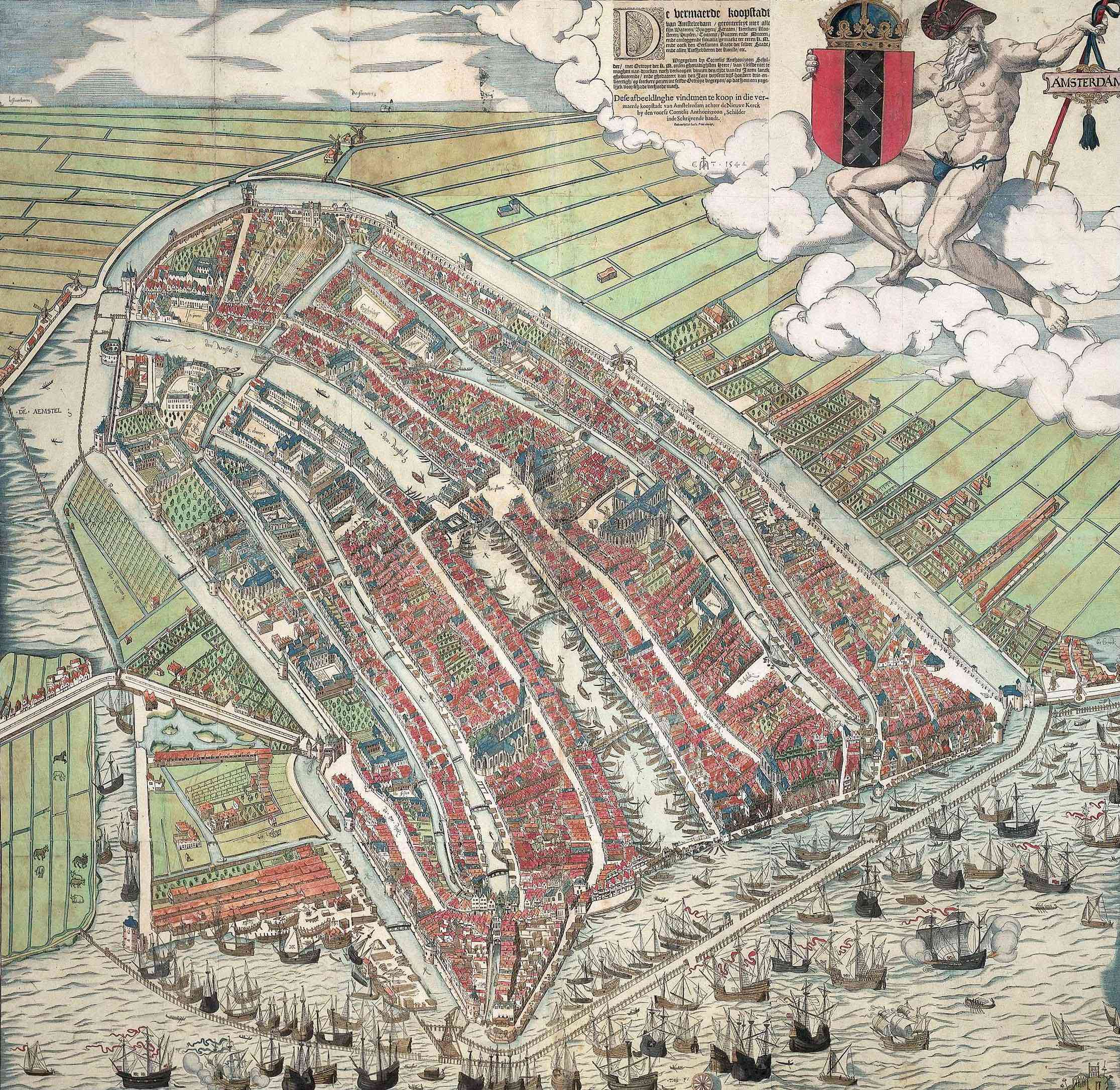 Carte panoramique d’Amsterdam par Cornelis Anthonisz, 1544. Au XVe siècle, la ville n’avait rien d’impressionnant, avec ses simples maisons en bois, généralement basses et dépourvues d’étage.© Koninklijk Oudheidkundig Genootschap, Amsterdam